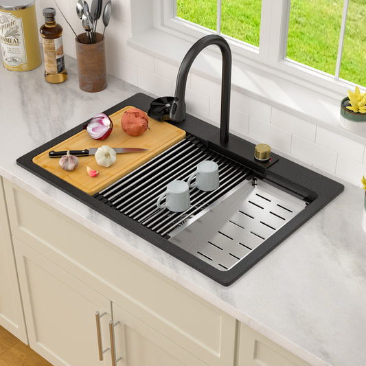 Dcolora Waterfall Smart Kitchen Sink 33x22 Drop In Single Bowl Multifunctional Kitchen Sinks With Faucet And Cup Washer,33 Inch Granite Composite (Black) DC-GBT7733FY