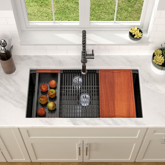 Dcolora 33" Black Undermount Kitchen Sink Workstation NANO-PVD Kitchen Sinks with Ledge Round Corner 16 Gauge Stainless Steel Single Bowl Basin, Gunmetal Black 33"x19’x10", DC-U7706