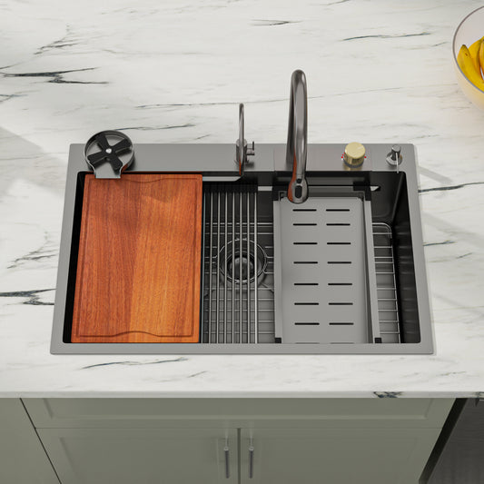 Dcolora 33x22 Black Waterfall Kitchen Sink Smart Workstation Sink with Faucet Combo 304 Stainlee Steel 16 Gauge Drop In Single Bowl Multifunctional Top Mount Sink DC-FY0002, 33 inch Gunmetal Black