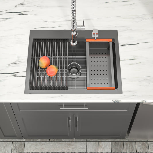 Dcolora 25 Black Kitchen SInk Drop In 25"x22" Gunmetal Black Topmount Kitchen Sink Workstation Topmount Sink Stainless Steel 16 Gauge Single Bowl Kitchen Laundry Utility Sink Basin, DC-T7752