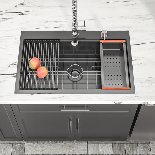 Dcolora 33 Inch Black Drop in Kitchen Sink Workstation Stainless Steel Gunmetal Black 16 Gauge 304 Stainless Steel Topmount Sink Single Bowl Extra Large Basin Kitchen Sinks,DC-T7765