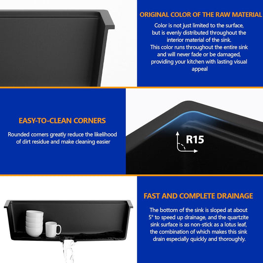 Dcolora 33 Inch Quartz Composite Black Kitchen Sink Undermount Sinks Deep Single Bowl, 33"x19", Round Corner, DC-GU7749