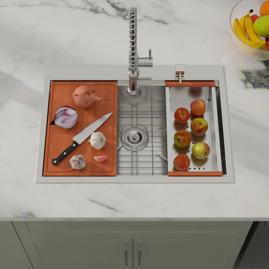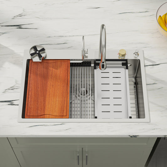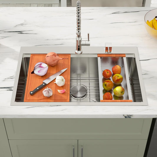 Dcolora 33x22 Drop In Kitchen Sink Workstation 16 Gauge 304 Stainless Steel Single Bowl Topmount Sinks, Round Corner 33"x22"x10", DC-T7741