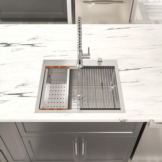 Dcolora 25x22 Inch Drop In Kitchen Sink Workstation 16 Gauge 304 Stainless Steel Single Bowl Top Mount Sink, Rounder Corner 25"x22"x10", DC-T7753