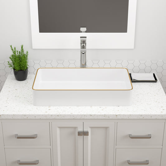 Dcolora Vessel Sink Rectangular 24"x14" White Vessel Sink with Glod Rim Ceramic Porcelain Rectangle Bathroom Vessel Sink Above Counter Vanity Sink Basin-DC-V8893
